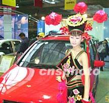 汽車(chē)展上身著少數(shù)民族服飾的少女 2001年5月20日 20:49