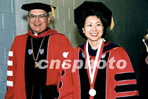 曾于一九九一年獲紐約圣若望大學(xué)榮譽法學(xué)博士的趙小蘭,二00一年五月二十日在圣大第一百三十一屆畢業(yè)典禮上,獲頒象征該校非校友最高榮譽的金質(zhì)獎?wù)。圖為禮成后趙小蘭(右)與圣若望大學(xué)校長海靈頓穿過走廊,步入會見廳,接受各界來賓及親友祝賀。中新社圖 龔文謨 攝