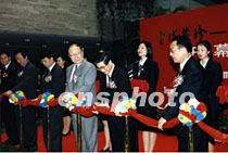紀(jì)念西藏和平解放五十周年——《雪域珍藏——西藏文物精華展》二十六日在上海博物館開幕。上海市委書記黃菊(前右二)、市長(zhǎng)徐匡迪(前右三)及西藏自治區(qū)主席列確(前右一)為展覽剪彩。中新社圖 姜煜 攝