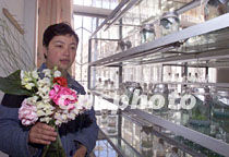西藏自治區(qū)高原生物研究所的米瑪潘多日向人們展示她們培育出的高原鮮花,她和另外三位女性研究人員培育出很多適應(yīng)高原環(huán)境的花卉,美化了西藏人的生活。中新社記者 滿會喬 攝