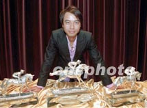 歌星李克勤1日在香港出席「2000/01年度香港賽馬會(huì)冠軍人馬獎(jiǎng)」記者會(huì),與多個(gè)精致馬匹獎(jiǎng)座合照。中新社傳真鄧慶樂(lè)攝