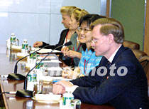 石廣生會見美貿(mào)易代表 雙方還將進一步商議 2001年6月5日 15:44 ![]() 石廣生與美國貿(mào)易談判代表羅伯特·佐立克一行會晤。中新社記者 潘索菲 攝 ![]() 二○○一年APEC貿(mào)易部長會議將于六月六日開幕。會議主席、中國外經(jīng)貿(mào)部部長石廣生和中國代表團團長、外經(jīng)貿(mào)部首席談判代表龍永圖,五日在上海國際會議中心與經(jīng)濟體代表團團長舉行雙邊會談。圖為美國貿(mào)易談判代表羅伯特·佐立克。中新社記者 潘索菲 攝