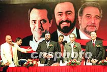 圖:三大男高音演唱會新聞發(fā)布會 2001年06月21日 18:46 ![]() 世界三大男高音北京紫禁城演唱會新聞發(fā)布會21日在北京舉行,先期到達北京的帕瓦羅蒂、卡雷拉斯和三大男高音的經濟人魯?shù)浪沟瘸鱿⒒卮鹆酥型庥浾叩奶釂。中新社記?李剛 攝