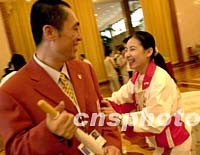 中國著名導(dǎo)演張藝謀與奧運(yùn)會冠軍劉璇,在中國駐莫斯科大使館互相祝賀北京申辦奧運(yùn)會成功。中新社記者 賈國榮 攝