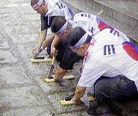 圖文:韓國20人斬斷手指抗議小泉參拜靖國神社 2001年08月13日 15:06 ![]() 法新/圖 中新網(wǎng)北京8月13日消息:韓國漢城二十人公開斬斷手指,以血抗議日本首相小泉純一郎參拜靖國神社。 據(jù)韓國電視臺報道,二十名男子在漢城獨(dú)立門前抗議,高叫口號,指責(zé)小泉純一郎到供奉戰(zhàn)犯的靖國神社參拜。男子接著拿出長柄大鐮刀,斬斷尾指抗議。 有目擊者表示,該批男子較早時被阻止在日本大使館前示威。警方暫時沒有評論事件。 |