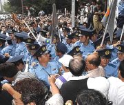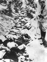 圖文:抗戰(zhàn)勝利56周年 過(guò)半日閣員到靖國(guó)神社 2001年08月15日 14:19 ![]() 支持和反對(duì)首相小泉參拜靖國(guó)神社的團(tuán)體爆發(fā)沖突 ![]() 今天是抗戰(zhàn)勝利56周年,圖為南京大屠殺一幕 中新網(wǎng)東京8月15日消息:在一片怒哮聲中,日本5名閣員在戰(zhàn)敗56周年到靖國(guó)神社參拜。在神社外,支持和反對(duì)參拜神社的團(tuán)體爆發(fā)沖突。 日皇明仁夫婦和早已到靖國(guó)神社參拜的首相小泉純一郎則出席官方儀式,悼念戰(zhàn)爭(zhēng)死難者,對(duì)戰(zhàn)爭(zhēng)表達(dá)“最深切遺憾”。 供奉著戰(zhàn)爭(zhēng)亡魂的靖國(guó)神社今早熱鬧起來(lái),一些老兵和陣亡士兵遺屬,大清早便排隊(duì)進(jìn)入神社內(nèi)園參拜。同樣是一早現(xiàn)身神社的,還有日本農(nóng)水大臣武部勤,他是小泉政府中,第六位來(lái)到神社參拜的高級(jí)官員。 另外4名內(nèi)閣閣員和120名國(guó)會(huì)議員,今天也來(lái)到神社參拜,包括防衛(wèi)特任大臣中谷元、總務(wù)大臣片山虎之助、經(jīng)濟(jì)產(chǎn)業(yè)大臣平沼赳夫、和國(guó)家公安暨防災(zāi)特任大臣村井仁。也就是說(shuō),連小泉本人在內(nèi)的18名日本內(nèi)閣成員中,超過(guò)一半曾到靖國(guó)神社。 前首相橋本龍?zhí)珊蜄|京知事石原慎太郎也出現(xiàn)在參拜行列。 今天早上,日皇明仁夫婦和首相小泉純一郎按照傳統(tǒng)在東京武道館出席官方儀式,悼念戰(zhàn)爭(zhēng)死難者。 小泉純一郎在儀式上發(fā)言,承認(rèn)日本對(duì)很多國(guó)家,特別是亞洲國(guó)家?guī)?lái)極大的傷和痛苦,對(duì)戰(zhàn)爭(zhēng)表達(dá)“最深切遺憾”(deepest regret),并重申日本決心維持和平,并和鄰近保持友好關(guān)系。 日皇明仁說(shuō),他真誠(chéng)的希望戰(zhàn)爭(zhēng)的慘刻不會(huì)重演。日皇并在以菊花砌成的富士山標(biāo)志前默哀及鞠躬。 |