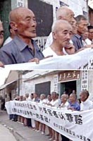 中國(guó)江蘇省崇山村村民,十五日在村委會(huì)前集會(huì),抗議日本首相小泉參拜供奉著二戰(zhàn)甲級(jí)戰(zhàn)犯的靖國(guó)神社。日本侵華期間,有上百名崇山村民,無辜慘死在日本于此地進(jìn)行的細(xì)菌戰(zhàn)之中。