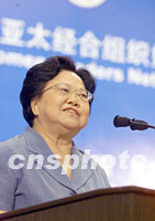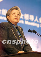 ![]() 2001年亞太經(jīng)合組織女領(lǐng)導(dǎo)人會(huì)議二十二日在北京人民大會(huì)堂開幕,中國全國人大常委會(huì)副委員長、中華全國婦女聯(lián)合會(huì)主席彭珮云在會(huì)上致詞。中新社記者 毛建軍 攝 |