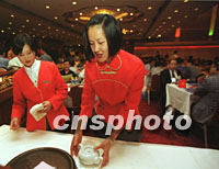 圖:為西部論壇客商服務(wù)小姐行唐代禮節(jié) 2001年09月05日 18:36 ![]() 西安唐樂宮的服務(wù)員五日以唐代禮節(jié)為參加西部論壇的賓客準備茶水,會上近二百家國內(nèi)外企業(yè)的代表在此進行了項目洽談。中新社記者 宋吉河 攝