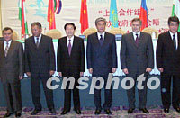 中國總理朱镕基九月十四日在哈薩克斯坦阿拉木圖出席"上海合作組織"成員國總理首次會晤。他在發(fā)言時表示,六國應(yīng)登高望遠,加強多邊經(jīng)貿(mào)合作。中新社圖 孟慶雷 攝