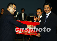 圖文:周潤發(fā)說,回歸后澳門變化很大 2001年10月05日 09:45 ![]() 由奧斯卡金像獎獲得者譚盾(右一)指揮、由多名國際音樂家和上海交響樂團演出的"臥虎藏龍"音樂會,4日晚在"第十五屆澳門國際音樂節(jié)"演出成功后,周潤發(fā)向音樂家表示祝賀。中新社圖 任晨鳴 攝 ![]() 香港巨星周潤發(fā)4日到澳門出席"第十五屆澳門國際音樂節(jié)"中的"臥虎藏龍"音樂會后,澳門特區(qū)政府社會文化司司長崔世安向周潤發(fā)頒發(fā)紀(jì)念品。中新社圖 任晨鳴 攝