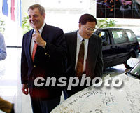 圖:通用汽車董事長史密斯比APEC其他代表多一份自豪 2001年10月17日 18:46 ![]() 上海APEC期間,有八百輛別克汽車作為禮賓及會(huì)務(wù)用車,為此美國通用汽車公司董事長史密斯比其他代表多一份自豪。圖為十七日抵達(dá)上海的史密斯在親臨上海通用汽車公司時(shí)說,當(dāng)年他第一個(gè)在上海首輛別克汽車上簽名。中新社記者 潘索菲 攝 |