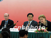 圖:e-APEC工作組在滬舉行新聞發(fā)布會 2001年10月19日 13:49 ![]() e-APEC工作組十九日在上海舉行新聞發(fā)布會,介紹數(shù)字APEC戰(zhàn)略。圖為工作組主席、來自中國信息產(chǎn)業(yè)部的陳因(中)、工作組副主席美國APEC官員拉里·格林伍德先生(左)和澳大利亞官員帕梅拉·費伊利女士(右)在新聞發(fā)布會上。中新社記者 潘索菲 攝 |