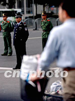 APEC花絮:天公作美 市民配合(附圖) 2001年10月20日 20:51 ![]() 出席APEC會(huì)議的各國(guó)首腦20日齊聚上海,浦東陸家嘴實(shí)行交通管制,一個(gè)騎車出行的市民從街頭整齊列隊(duì)站立的警員身邊經(jīng)過(guò),上海安全保衛(wèi)處于前所未有的一級(jí)警備狀態(tài)。中新社記者 王瑤 攝 ![]() 二十日上海APEC主會(huì)場(chǎng)區(qū)域地帶——浦東陸家嘴金融貿(mào)易區(qū)全面戒嚴(yán)。圖為正在執(zhí)行任務(wù)的武警。中新社記者 潘索菲 攝