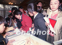 聚焦中國入世:中國高校采取舉措應(yīng)對"入世" 2001年11月10日 22:15 ![]() 入世將給中國經(jīng)濟(jì)帶來極大的商機(jī),使金融、國際貿(mào)易等經(jīng)濟(jì)專業(yè)成為今年研究生報(bào)名的熱點(diǎn)。圖為十日在2002年全國碩士生招生考試清華大學(xué)報(bào)名點(diǎn),場面十分火爆。中新社記者 張勤 攝