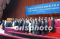 圖:中國加入WTO簽字儀式現(xiàn)場 2001年11月12日 02:43 ![]() 中國加入WTO簽字儀式于北京時間12日凌晨在多哈舉行,圖為簽字現(xiàn)場。中新社記者 錢興強 攝 |