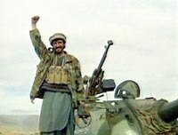 阿富汗北方聯(lián)盟一名士兵十二日在坦克上歡慶勝利。阿富汗北方聯(lián)盟日前氣勢(shì)如虹,繼奪取北部重鎮(zhèn)馬扎里沙里夫和北部四個(gè)省份后,宣稱又攻占了前首都塔盧坎。