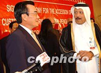 圖:WTO總干事對中國臺北加入世貿(mào)組織表示祝賀 2001年11月13日 10:08 ![]() 第四屆WTO部長級會議十二日在多哈舉行中國臺北加入世貿(mào)組織議定書簽字儀式。圖為會議主席卡塔爾財政、經(jīng)濟(jì)和貿(mào)易大臣卡邁爾,WTO總干事穆爾等向臺北代表團(tuán)團(tuán)長林信義表示祝賀。中新社記者 錢興強(qiáng) 攝 |