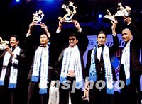 夏蒙2001世界男模大賽十二日晚在北京保利劇院落下帷幕,包括冠亞軍在內(nèi)的十七個(gè)獎(jiǎng)項(xiàng)各有其主。圖為獲得本屆男模大賽前五名的選手。從左至右依次為委內(nèi)瑞拉(季軍)、中國(guó)(亞軍)、印度(冠軍)、克羅地亞(第四名)和開(kāi)曼群島(第五名)選手。中新社圖