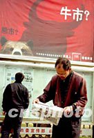 一位市民二十一日在北京街頭認真閱讀當日報紙的股市信息。入世后北京市民更加關注股市行情。中新社圖 劉殊瑾 攝