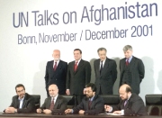 圖文:波恩會(huì)談結(jié)束 阿富汗四方簽署分權(quán)協(xié)議 2001年12月05日 19:45 ![]() 四方代表簽署協(xié)議 中新網(wǎng)北京12月5日消息:阿富汗4方代表于當(dāng)?shù)貢r(shí)間5日上10時(shí)10分,在波恩附近的彼得斯貝格賓館簽署了關(guān)于成立阿富汗臨時(shí)政府的協(xié)議,波恩會(huì)談在近9天馬拉松式的談判后終于落下帷幕。 根據(jù)協(xié)議,阿富汗南部普什圖族領(lǐng)導(dǎo)人薩耶德·哈米德·考爾紹伊將出任臨時(shí)行政當(dāng)局主席一職,北方聯(lián)盟則占據(jù)了臨時(shí)行政當(dāng)局中負(fù)責(zé)內(nèi)政、外交和國防等事務(wù)的關(guān)鍵職位。臨時(shí)政府由29名成員組成,本月22日起運(yùn)作,任期6個(gè)月。 考爾紹伊曾在20世紀(jì)90年代出任過阿富汗副外長,他目前正在阿富汗坎大哈市附近指揮部隊(duì)與塔利班士兵作戰(zhàn)。 德國總理施羅德說,協(xié)議的達(dá)成顯示國際社會(huì)有勇氣和能力解決所面臨的復(fù)雜問題,他希望會(huì)談各方能夠切實(shí)履行所達(dá)成的協(xié)議。他說,協(xié)議為阿富汗重建創(chuàng)造了必要的前提,德國將和其他歐盟國家一道,為阿富汗戰(zhàn)后重建提供“實(shí)質(zhì)性”的幫助。 在多方壓力下,參加阿富汗問題會(huì)談的各方代表經(jīng)過4日晚通宵達(dá)旦的艱苦談判,終于在5日清晨就組成臨時(shí)政府的人選問題取得一致,從而為協(xié)議的最終簽署鋪平了道路。 |