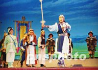 圖文:《射雕英雄傳》搬上京劇舞臺(tái)亮相南京 2001年12月12日 08:56 ![]() 武漢市京劇團(tuán)根據(jù)金庸的武俠小說《射雕英雄傳》改編而成的同名京劇,十二月十日晚在南京大行宮會(huì)堂成功上演,成為第三屆中國京劇節(jié)唯一的一臺(tái)武俠劇。原著中描寫高深莫測的武功借助京劇中的“出手”及現(xiàn)代特技,得到了較好表現(xiàn)。中新社圖 劉小楚 攝