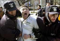 布什來(lái)訪前韓民間團(tuán)體警告美國(guó)不要強(qiáng)售戰(zhàn)機(jī)(圖) 2002年02月19日 15:00 ![]() 一名抗議布什訪問(wèn)的韓國(guó)學(xué)生被警察帶走 中新網(wǎng)北京2月19日消息:美國(guó)總統(tǒng)布什今天即將抵達(dá)韓國(guó)首都漢城與金大中總統(tǒng)舉行會(huì)談,韓國(guó)軍隊(duì)和警察處于高度戒備狀態(tài)。 韓國(guó)官員表示,一些民間和學(xué)生團(tuán)體已經(jīng)計(jì)劃好在布什訪問(wèn)時(shí)舉行集會(huì)和游行示威活動(dòng)。 數(shù)個(gè)民間團(tuán)體今天警告美國(guó)不要對(duì)韓國(guó)施壓,在兩國(guó)首腦會(huì)談期間要求購(gòu)買美國(guó)波音公司的F-15戰(zhàn)斗機(jī)。 這六個(gè)民間團(tuán)體發(fā)表聯(lián)合聲明說(shuō):“F-15戰(zhàn)斗機(jī)正在被淘汰。政府不應(yīng)該購(gòu)買F-15這種即將停產(chǎn)的機(jī)型。”