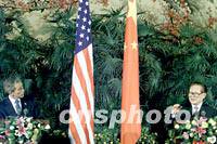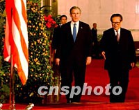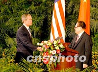 ![]() 中國國家主席江澤民請美國總統(tǒng)布什登上北京的紅地毯,共同出席二十一日中午會見記者的電視直播。中新社記者 賈國榮 攝