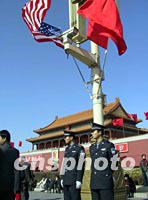 圖:五星紅旗與星條旗飄揚(yáng)在天安門前 2002年02月21日 16:11 ![]() 美國總統(tǒng)布什二月二十一日來華訪問,兩國國旗同時(shí)在天安門前飄揚(yáng)。中新社圖 杜洋 攝