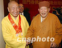法門寺佛指舍利赴臺(tái)供奉新聞發(fā)布會(huì),日前在西安喜來登大酒店舉行,中國佛教協(xié)會(huì)等有關(guān)人士和臺(tái)灣佛教人士以及來自大陸、港臺(tái)的眾多記者參加了發(fā)布會(huì)。圖為臺(tái)灣惟覺法師與法門寺凈一方丈在發(fā)布會(huì)上。中新社記者 錢興強(qiáng) 攝