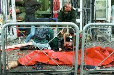 耶路撒冷發(fā)生自殺炸彈襲擊 至少兩人死亡(圖) 2002年03月21日 23:29 ![]() 一名傷者在死者遺體邊接受急救 中新網(wǎng)北京3月21日消息:耶路撒冷市中心今天發(fā)生自殺性炸彈襲擊,造成至少兩人死亡,另有四十人受傷。此事對(duì)美國(guó)推動(dòng)中東和平進(jìn)程的努力無(wú)疑又構(gòu)成沉重打擊。 當(dāng)?shù)鼐秸f(shuō),事件發(fā)生在當(dāng)?shù)貢r(shí)間21日下午4時(shí)25分左右。出事地點(diǎn)靠近最近發(fā)生的多起槍擊與炸彈襲擊地區(qū)。 目擊者說(shuō),多輛救傷車(chē)在事發(fā)后趕到現(xiàn)場(chǎng)并載走許多傷者,警方已封鎖現(xiàn)場(chǎng),方便進(jìn)行救人的工作。 據(jù)以色列電臺(tái)報(bào)道,初步報(bào)告指出,有7名傷者的傷勢(shì)相當(dāng)嚴(yán)重。
