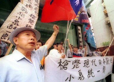 圖文:當(dāng)局懦弱膽小 臺(tái)灣民眾示威抗議小泉參拜 2002年04月24日 10:42 在臺(tái)北的日本交流協(xié)會(huì)門外,示威民眾拉起橫幅抗議日本首相小泉純一郎日前參拜靖國(guó)神社。(法新社) 中新網(wǎng)香港4月24日消息:臺(tái)北訊,一批臺(tái)灣民眾周二上街示威,高呼“打倒日本軍國(guó)主義”的口號(hào),抗議日本首相小泉純一郎參拜靖國(guó)神社。 綜合外電報(bào)道,示威者聚集在日本駐臺(tái)北代表辦事處外,揮動(dòng)拳頭,高舉寫有“處死當(dāng)代戰(zhàn)犯小泉純一郎”的標(biāo)語(yǔ)牌。 周日,小泉到靖國(guó)神社參拜,靖國(guó)神社供奉有包括二戰(zhàn)甲級(jí)戰(zhàn)犯東條英機(jī)在內(nèi)的一批戰(zhàn)犯的牌位,是宣揚(yáng)和支持軍國(guó)主義對(duì)外侵略戰(zhàn)爭(zhēng)的精神支柱和象征,也是日本一些極右人士企圖為戰(zhàn)爭(zhēng)罪犯張目、為軍國(guó)主義借尸還魂的封神壇。 小泉繼去年再次參拜靖國(guó)神社,引起中國(guó)大陸及韓國(guó)政府的憤怒,兩國(guó)并提出正式抗議。 但臺(tái)灣當(dāng)局執(zhí)行親日本的政策,避免批評(píng)小泉,在臺(tái)灣,抗議示威的規(guī)模比韓國(guó)的要小。 陳姓示威者說(shuō),臺(tái)灣政府懦弱,膽小,不敢譴責(zé)小泉參拜。他說(shuō),“我們不須憎恨日本人,但我們不能忘記歷史! 示威者中許多人經(jīng)歷過(guò)日本對(duì)中國(guó)的野蠻侵略,他們認(rèn)為日本仍不肯面對(duì)歷史,承認(rèn)其戰(zhàn)爭(zhēng)暴行。 相關(guān)報(bào)道:臺(tái)灣報(bào)紙發(fā)表社論譴責(zé)小泉再度參拜靖國(guó)神社 相關(guān)報(bào)道:臺(tái)北"理解與寬容"小泉參拜被批患有"歷史軟骨癥" 相關(guān)報(bào)道:中國(guó)駐日大使就小泉參拜靖國(guó)神社提出嚴(yán)正交涉 相關(guān)報(bào)道:南京大屠殺幸存者集會(huì)抗議小泉參拜靖國(guó)神社 相關(guān)報(bào)道:香港多個(gè)團(tuán)體到日本駐港機(jī)構(gòu)請(qǐng)?jiān)?抗議小泉參拜 相關(guān)報(bào)道:中國(guó)對(duì)小泉純一郎參拜靖國(guó)神社表示強(qiáng)烈不滿 相關(guān)報(bào)道:李肇星就日本首相參拜靖國(guó)神社向日方嚴(yán)正交涉 相關(guān)報(bào)道:陳水扁首次就小泉參拜靖國(guó)神社發(fā)表評(píng)論 相關(guān)報(bào)道:李登輝再次鼓吹小泉參拜靖國(guó)神社很自然 相關(guān)報(bào)道:小泉參拜靖國(guó)神社 中方表示強(qiáng)烈不滿和憤慨