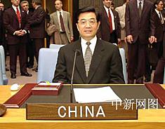 圖:胡錦濤在聯(lián)合國安理會做"五秒鐘代表" 2002年04月30日 08:44 ![]() 美國東部時間四月二十九日下午,中國國家副主席胡錦濤一行在首次對美國進(jìn)行正式訪問期間,來到紐約聯(lián)合國總部參觀。在聯(lián)合國安理會會議廳中,胡錦濤坐到常任理事國中國的代表席上留影,并笑稱:“讓我當(dāng)個五秒鐘的代表吧!敝行律缬浾 陳建 攝