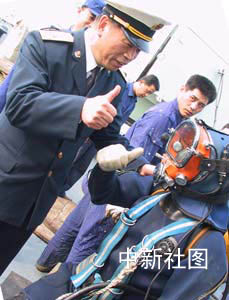 圖:北海艦隊(duì)副司令員親臨救撈現(xiàn)場(chǎng)慰問(wèn)潛水員 2002年05月11日 21:50 ![]() 北海艦隊(duì)副司令員張巖十一日親臨部隊(duì)救撈現(xiàn)場(chǎng)慰問(wèn)潛水員,充分肯定他們?cè)谒丫裙ぷ髦械谋憩F(xiàn)。目前“五·七”空難遇難者遺體已有七十五具被打撈出水,其中海軍方面打撈了二十四具。(中新社記者 王麗南 攝)