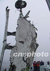 圖: "5.7"空難又打撈出一塊較大飛機(jī)殘骸 2002年05月13日 13:58 ![]() 尋找“五·七”空難失事飛機(jī)黑匣子的工作正在緊張進(jìn)行。十二日中午,北海艦隊(duì)派出的救撈船又打撈出一塊較大飛機(jī)殘骸,該殘骸長(zhǎng)約七點(diǎn)六到八米左右,圖為飛機(jī)起落架部位。中新社記者 王麗南 攝