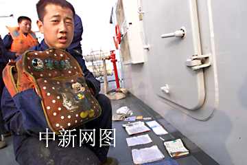 北海艦隊(duì)某部一百三十八號(hào)打撈船官兵打撈到小申華的書包。據(jù)了解,官兵們已連續(xù)作戰(zhàn)數(shù)晝夜。中新社圖 王麗南 攝