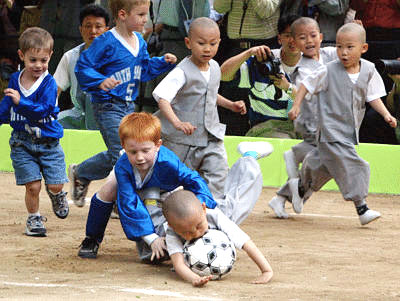 圖文:韓國小和尚比試腳法 “是否少林足球?” 2002年05月15日 10:18 ![]() 隨著世界杯的臨近,各地都在舉行豐富多彩的活動(dòng)。14日漢城曹溪寺的童子和尚們與駐韓美國孩子們一起進(jìn)行了一場別開生面的友誼賽。圖為,一童子尚由于過于快速帶球,一不小心跌倒在地。(據(jù)《中央日?qǐng)?bào)》)