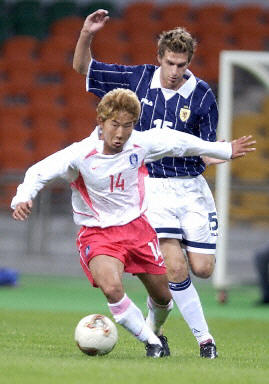 4-1完美屠戮蘇格蘭隊 太極虎韓國熱身也瘋狂(圖) 2002年05月16日 22:21 ![]() 李天秀為韓國隊敲開勝利之門 中新網(wǎng)漢城5月16日消息:在剛剛結(jié)束的一場世界杯熱身比賽中,東道主之一的韓國主場發(fā)揮神勇,以4-1完美“屠殺”了前德國國家隊主教練福格茨執(zhí)教的蘇格蘭隊,從而完成了6場熱身不敗。其中李天秀成為場上最耀眼的明星,他的第一個進球堪稱世界級,而安貞煥則梅開二度。韓國隊的另外一個入球由尹晶煥完成,蘇格蘭隊由首次入選國家隊的多比打入一粒安慰性入球。 蘇格蘭由于沖擊世界杯失利,球隊面臨著重組。在福格茨上任后在上個月的第一場國家隊比賽中,就以0-5慘敗給法國隊。在與韓國隊的比賽中,由于多名主力因傷缺陣,因此球隊的實力又打了折扣。 比賽的僵局在第15分鐘就打破,號稱韓國“天才新秀”的李天秀得到后場長傳后,利用嫻熟的個人技術(shù)盤過了幾名防守隊員后,又帶球過了門將,在對方最后一名后衛(wèi)的干擾下,冷靜的將球鏟射入網(wǎng)。 一球領(lǐng)先的韓國隊得勢不饒人,四分鐘之后,李天秀在左邊的射門稍稍偏出。隨后,李榮杓傳球給黃善洪,對方門將在撲了一下后球險些滾入大門。相對而言,蘇格蘭則顯得沒有多少機會。 下半場希丁克用在意大利佩魯賈俱樂部效力的安貞煥換下了老將黃善洪。安貞煥很快就表現(xiàn)出過人的實力,他在第57分鐘一腳有力的遠射將球打進。第67分鐘,同樣替補上場的中場尹晶煥同樣在禁區(qū)外抽射,將比分?jǐn)U大為3比0。第74分鐘,卡首次出場的蘇格蘭前鋒多比接隊友開出的任意球,頭球攻門得手。補時階段,安貞煥以一記精準(zhǔn)的挑射再下一城。 在隨后的比賽中,韓國還將與英格蘭和法國隊進行熱身。(宋方燦)