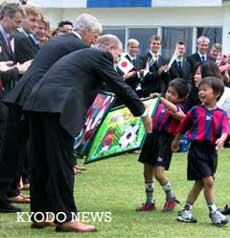 法國等5個(gè)世界杯參賽國相繼到達(dá)日本最后備戰(zhàn) 2002年05月21日 15:07 ![]() 丹麥代表隊(duì)抵達(dá)和歌山。在和歌山集訓(xùn)地向丹麥選手贈(zèng)送足球繪畫的幼兒園小朋友(共同社)