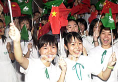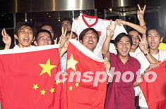圖:澳門學(xué)生歡迎中國國家足球隊(duì) 2002年05月24日 19:12 ![]() 澳門教業(yè)高二的一百名學(xué)生23日晚高舉中國國旗和澳門特區(qū)區(qū)旗,歡迎中國國家足球隊(duì)的到來。中新社記者 李剛 攝