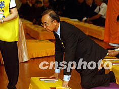 五月三十一日,“華航” 董事長李云寧參加臺北佛教界追思遇難者法會時下跪,向遇難者致哀。中新社記者 任晨鳴 攝