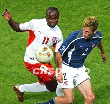 圖:波蘭3:1美國 奧利薩德貝與哈久克爭搶 2002年06月14日 21:44 ![]() 韓日世界杯D組波蘭隊與美國隊的比賽結(jié)束,比分為波蘭隊3-1戰(zhàn)勝美國,11號奧利薩德貝為波蘭隊先入一球,9號克里扎洛維茨攻入第二球,14號澤瓦拉科夫攻入第三球。美國隊21號多諾萬攻入一球。圖為波蘭隊奧利薩德貝與美國哈久克爭搶。