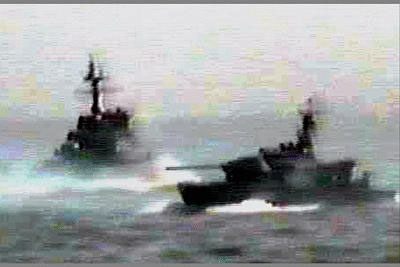 圖:朝鮮警備艇與韓國海軍高速艦在海面對峙 2002年06月29日 19:57 ![]() 韓國和朝鮮艦艇今晨在黃海海面發(fā)生交火,造成韓方4人死亡,至少18人受傷。此圖顯示朝鮮警備艇(右)與韓國海軍高速艇正在對峙之中。圖片為現(xiàn)場韓國海軍作戰(zhàn)部隊攝像機(jī)拍攝。(韓國聯(lián)合通訊社圖) 相關(guān)報道:韓國總統(tǒng)金大中的小兒子涉嫌受賄等罪出庭受審 相關(guān)報道:事件綜述:朝韓雙方互相指責(zé) 稱將采取應(yīng)對措施 相關(guān)報道:韓朝海上交火事件:韓軍艇長等4人死亡22人受傷 相關(guān)報道:朝韓艦艇在海上交火 金大中今晚不看世界杯比賽 相關(guān)報道:新聞背景:1998年至今韓朝兩國海難事故大事記 相關(guān)報道:圖文:朝鮮和韓國軍艦發(fā)生交火 4名韓國人死亡