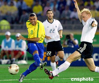圖:羅納爾多再進(jìn)一球 巴西2:0德國(guó) 2002年06月30日 20:40 ![]() 2002世界杯決賽,下半時(shí)羅納爾多再進(jìn)一球,巴西隊(duì)2:0領(lǐng)先德國(guó)隊(duì)。圖為羅納爾多在場(chǎng)上拼搶。