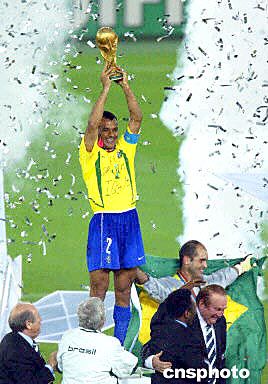 組圖:德國0:2巴西 卡福高舉大力神金杯 2002年06月30日 21:41 ![]() ![]() 6月30日晚,2002韓日世界杯決賽巴西隊VS德國隊的比賽已經(jīng)結(jié)束,最終巴西隊以2比0戰(zhàn)勝德國隊,羅納爾多表現(xiàn)出色獨進(jìn)兩球。圖為巴西隊隊長卡福高舉大力神金杯。