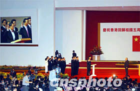 中新社香港七月一日電(記者張傳熙黃少華)慶祝香港回歸五周年大會暨第二屆香港特區(qū)政府就職典禮今天上午在香港會展中心新翼大會堂舉行。香港特別行政區(qū)第二任行政長官董建華和第二屆特區(qū)政府十九名主要官員在莊嚴的儀式上宣誓就職。 世界的目光今早再度投向美麗的香港。座落在維多利亞港畔的香港會展中心新翼大會堂今早燈光璀璨,嘉賓如潮。紅色成了就職典禮的主色調(diào):呈梯形狀的主席臺上鋪著紅色地毯,政府官員沿著紅色臺階,魚貫登臺宣誓。 這標志著香港特區(qū)首屆政府已順利完成歷史使命,繼任的新一屆政府已全部到位并開始運作。 出席儀式的國家主席江澤民代表中央政府和全國各族人們,向新就任的特區(qū)第二任行政長官董建華和第二屆政府主要官員、行政會議成員表示祝賀。江澤民還在會上發(fā)表講話,希望特區(qū)政府與各界人士與時并進,積極進取,努力創(chuàng)造香港更加美好的未來。 上午,鮮花、綠樹裝點的香港會展中心新翼五樓大禮堂一片喜慶。會場正中的主席臺上方,懸掛著國旗和香港特區(qū)區(qū)旗。江澤民主席在行政長官董建華的陪同下步入大會堂時,全場二千名嘉賓起立鼓掌,向江澤民的到來表示熱烈歡迎。 八時五十九分,就職典禮在雄壯的國歌聲中拉開帷幕。最先走上主席臺宣誓就職的是行政長官董建華。國家主席江澤民監(jiān)誓。董建華莊嚴地舉起右手,宣誓:“本人就任中華人民共和國香港特別行政區(qū)行政長官,定當擁護中華人民共和國香港特別行政區(qū)基本法,效忠中華人民共和國香港特別行政區(qū),盡忠職守,遵守法律,廉潔奉公,為香港特別行政區(qū)服務(wù),對中華人民共和國中央人民政府和香港特別行政區(qū)負責(zé)”。 宣誓畢,江澤民主席和董建華緊緊握手,全場掌聲如潮。 五年前的今天,董建華第一次宣誓就任首屆特區(qū)行政長官。從那時起,香港的歷史改寫了,香港回到了祖國的懷抱,開始了港人治港的新里程。今天董建華再次宣誓就職,不同的是,他標志著新一屆特區(qū)政府將承前啟后管治香港,對香港的未來將會有更多的承擔(dān)。 接著,江澤民監(jiān)誓下宣誓就職的還有由董建華提名、中央政府任命的第二屆特區(qū)政府十九名主要官員,包括三司十一局以及警務(wù)處、入境處、海關(guān)、廉政公署以及審計處官員。而改組后的行政會議十九名成員也在董建華的監(jiān)誓下,由政務(wù)司司長曾蔭權(quán)帶領(lǐng)宣誓就職。 第二屆行政長官董建華在宣誓禮畢后發(fā)表講話。他說,在我即將履行第二任行政長官職責(zé)的時候,我意識到所面對的形勢是嚴峻的,擔(dān)任的責(zé)任是重大的。他說,帶領(lǐng)香港經(jīng)濟走出困境,恢復(fù)市民對前景的信心,是本屆政府面對的挑戰(zhàn)。 他表示,政府將竭盡所能,充分利用內(nèi)地經(jīng)濟發(fā)展的機會,開拓香港的發(fā)展空間,香港將會加快和廣東省的全面合作。他表示相信,過去五年的調(diào)整和適應(yīng),雖然歷盡艱辛,但卻又為香港將來的興旺奠定了基礎(chǔ)。他相信香港在各界的精誠團結(jié)努力下,一定能夠走出困境。 江澤民主席在會上發(fā)表講話,充分肯定了香港過去五年所取得的成就。江澤民指出,香港回歸祖國以來的五年,是“一國兩制”由科學(xué)構(gòu)想變?yōu)樯鷦蝇F(xiàn)實的五年,也是董建華先生領(lǐng)導(dǎo)的特區(qū)政府團結(jié)各界人士不斷克服困難、奮力前進的五年。他說今天的香港,“一國兩制”、“港人治港”、高度自治方針得到全面落實,原有的資本主義制度保持不變,廣大居民繼續(xù)以自己習(xí)慣的方式生活。香港仍然保持著自由港的特色和國際貿(mào)易、金融、航運中心的地位,繼續(xù)被公認為亞洲乃至全球最具活力的地區(qū)之一。 江澤民說,事實充分證明,“一國兩制”是完全行得通的,董建華先生及其領(lǐng)導(dǎo)的特區(qū)政府是具有駕馭復(fù)雜局勢的能力的,香港人是完全能夠治理好香港的。他說,五年來我們所獲得的經(jīng)驗和體會,歸結(jié)起來,就是在任何情況下都必須全面正確地貫徹“一國兩制”的方針和香港基本法,全力支持行政長官和特區(qū)政府依法施政。 江澤民說,現(xiàn)在世界多極化和經(jīng)濟全球化趨勢深入發(fā)展,科技進步日新月異,綜合國力競爭日趨激烈,國際局勢正在發(fā)生深刻的變化。他說,中國正在實施現(xiàn)代化建設(shè)的第三步戰(zhàn)略目標,今后五到十年,也是香港經(jīng)濟和社會發(fā)展的關(guān)鍵時期。 江澤民在講話中,還提出三點希望:希望香港各界更好地適應(yīng)香港回歸后的發(fā)展形勢,當好香港和偉大祖國的主人;希望特區(qū)行政、立法、司法機關(guān)不斷提高施政和執(zhí)法水平,進一步落實行政主導(dǎo)體制,更好地為香港社會服務(wù);希望各界人士堅定信心,自強不息,努力開創(chuàng)香港經(jīng)濟發(fā)展的新局面。 江澤民還強調(diào),中央政府將繼續(xù)支持和幫助香港恢復(fù)和發(fā)展經(jīng)濟。 簡樸隆重的就職宣誓儀式在九時四十五分結(jié)束。儀式結(jié)束后,內(nèi)地與香港的藝術(shù)家和表演團體表演了精彩的文藝節(jié)目,表達了全國人民對香港回歸五周年的喜悅與歡慶。