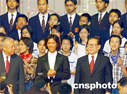 圖:江澤民登臺(tái)感謝全體演出人員 2002年07月01日 11:36 ![]() 7月1日上午,香港隆重舉行慶祝香港回歸祖國(guó)五周年大會(huì)暨特區(qū)第二屆政府就職典禮,國(guó)家主席江澤民登臺(tái)感謝全體演出人員。中新社傳真任晨鳴攝