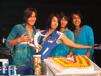 吳建豪過生日 F4和歌迷一起開心!按蟆眽(圖) 2002年08月08日 09:42 ![]() F4成員為吳建豪(左二)賀生辰 中新網(wǎng)香港8月8日消息:F4前日旋風(fēng)襲港出席百事的首播會(huì),其后只有吳建豪多留港一天,除了跟歌迷共慶生日外,還為新歌《聽身體唱歌》招募MV女主角,另三位成員已先行返臺(tái)灣。 據(jù)此間文匯報(bào)報(bào)道說,前晚的首播會(huì)上,吳建豪和言承旭突然走下臺(tái)與歌迷握手,引起現(xiàn)場一度混亂,受到歌迷的熱情感染,言承旭和朱孝天來了兩下“胸頂胸”,教歌迷看得怦然心動(dòng)。吳建豪和仔仔周渝民差點(diǎn)被歌迷的熱情感動(dòng)得掉下淚來,一些歌迷更送上生日禮物給壽星仔吳建豪。 活動(dòng)完畢后,他們便拉隊(duì)到郭富城的餐聽為建豪慶祝生日,城城雖沒有出現(xiàn),也送來蛋糕和鮮花。 壽星仔吳建豪昨午繼續(xù)同二百位歌迷慶祝,期間他以廣東話向在場歌迷說:“我愛你,多謝!彼趾芰粜目窗宋缓蜻x的女主角,他對(duì)各人的表現(xiàn)都很滿意。有位參賽者更表演一字馬,惜未能為她取得更高分。 吳建豪切生日蛋糕時(shí),突然興奮得拿著切蛋糕的刀轉(zhuǎn)圈,似是在耍雜技,切過蛋糕后,他迅速舔一舔刀上的蛋糕。其后,他表示因在小時(shí)候沒有太多朋友,便經(jīng)常拿刀當(dāng)玩具般玩。 問到剛挑選出來的MV女主角,到時(shí)建豪和她可有親熱鏡頭,建豪磨拳擦掌說:“不知道,要看導(dǎo)演的安排,相信歌迷知道我是工作,不會(huì)生氣!