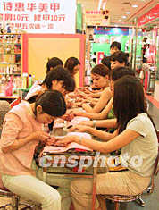 圖:廣州女郎時(shí)興美甲 2002年08月11日 19:05 ![]() 廣州時(shí)興妝扮指甲,雙休日美甲店里坐滿了美甲女郎。作者:邢健