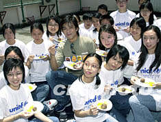 ![]() 聯(lián)合國(guó)兒童基金香港會(huì)員會(huì)大使陳曉東8月13日在香港出席「UNICEF小熊穿梭全城Fun」慈善義賣活動(dòng)記者會(huì),陳曉東與一眾義工朋友烈日下一同參與品嘗「貧苦午餐」。鄧慶樂 攝